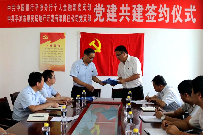 近日,中共平凉市惠民房地产开发有限责任公司党支部与中共中国银行平凉分行个人金融部党支部党建共建签约仪式在中国银行平凉分行举行。惠民投资公司副总经理柳振源、中国银行平凉分行纪检书记秦建钢、副行长杨震荣出席签约仪式。