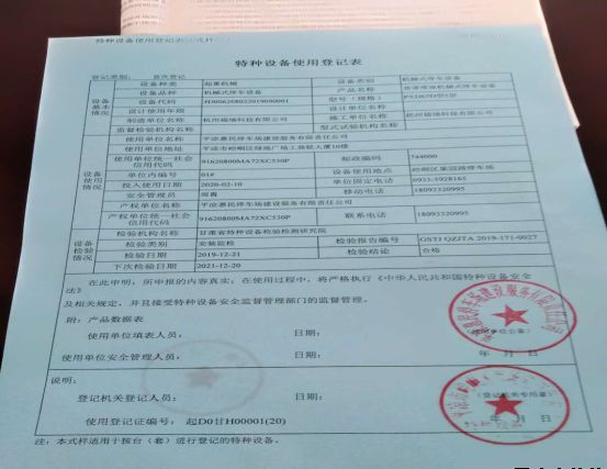 为保证果园路立体停车库安全运营,2019年12月15日设备安装厂家委托甘肃省特种设备检验检测研究院对果园路立体停车库设备进行了现场检验,于2019年12月21日出具了检验报告。按照特种设备管理办法的要求,停车场公司积极衔接崆峒区质量监督局,提交了办理特种设备使用登记证所需的各种资料及证明文件,2020年3月5日顺利取得果园路立体停车库特种设备使用登记证。
