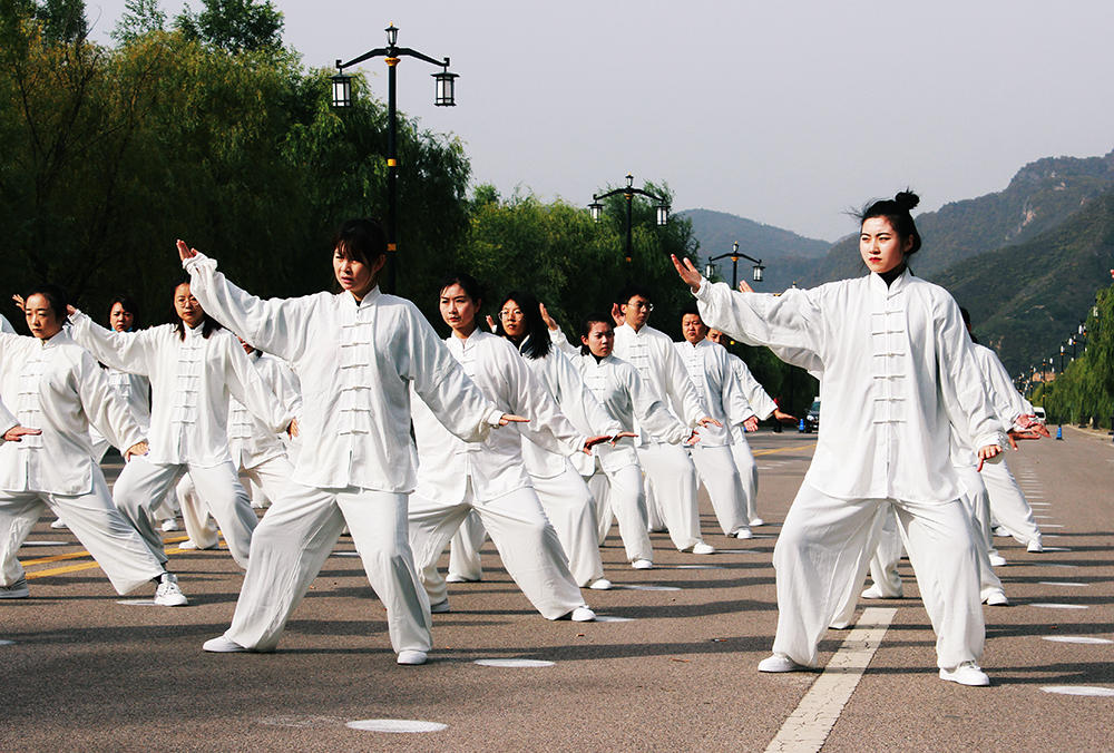 展演中,随着舒缓的崆峒太极拳28式音乐,50多名参演人员身着白色太极拳服装组成方队,太极爱好者们由静而动,表演动作整齐一致,一招一式,刚柔相济,整个展演现场气势恢弘。