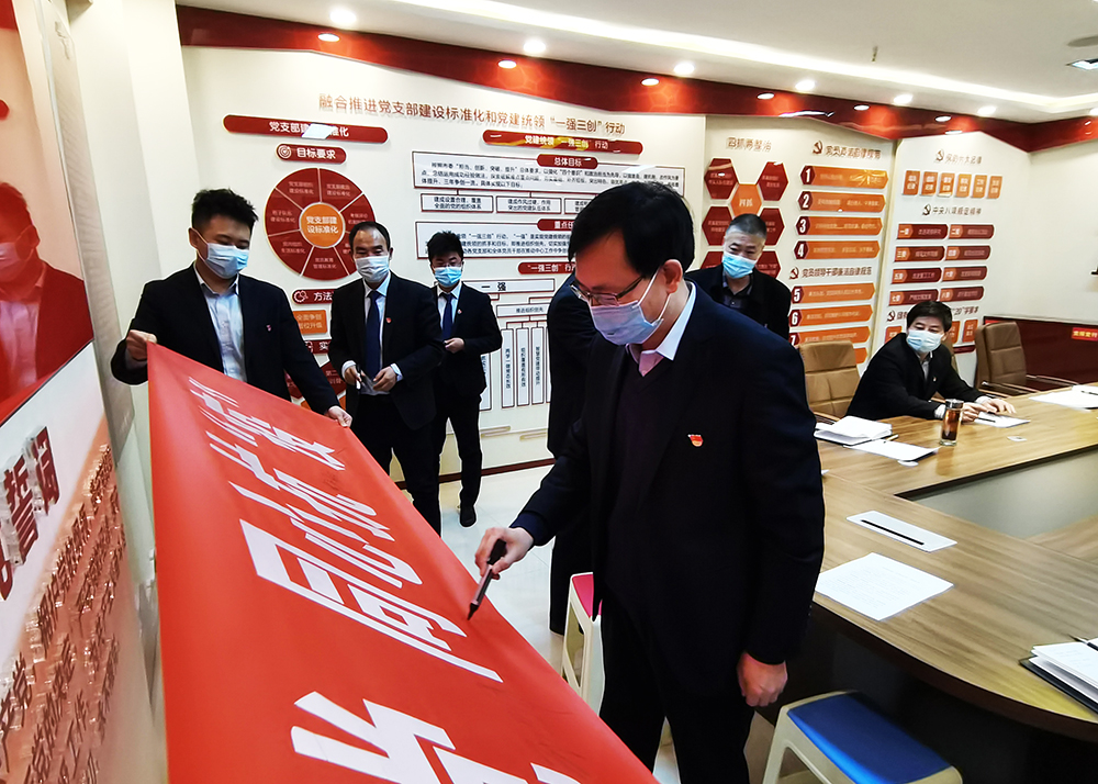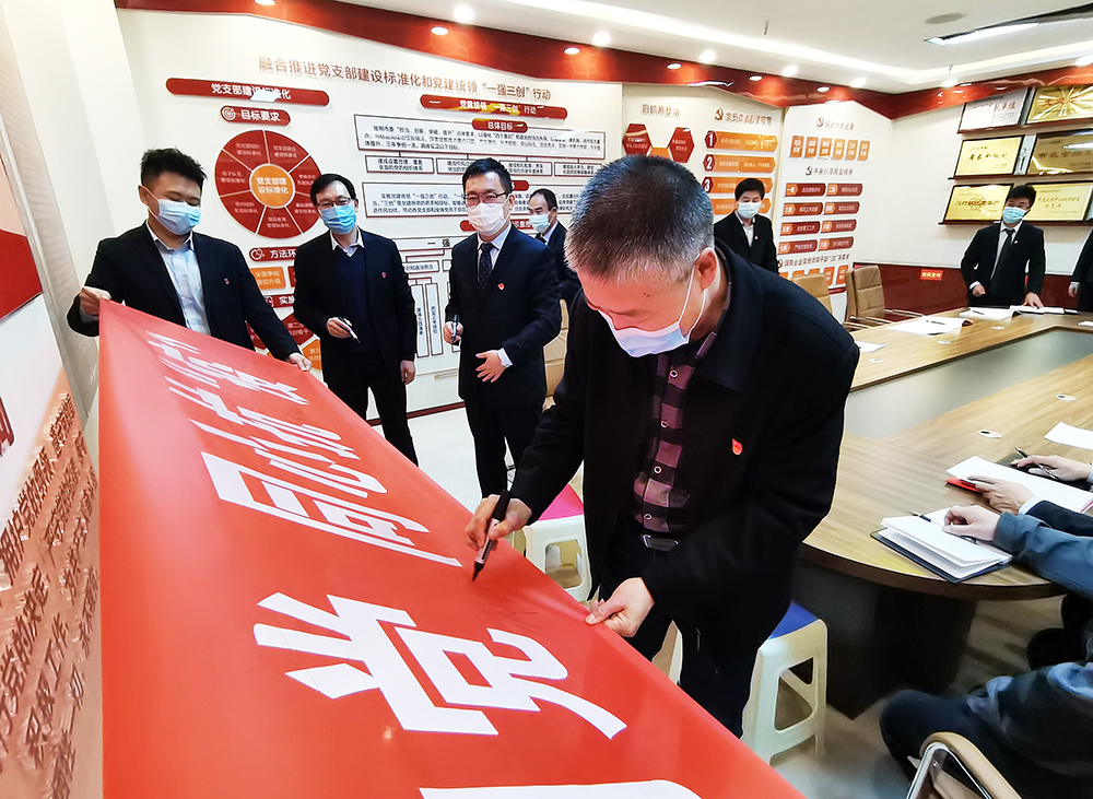 活动现场宣读了“共同抗疫、文明过节”倡议书,全体党员面对党旗郑重宣誓,坚决做好疫情防控工作,随后,参与活动人员纷纷在印有“赤心向党,同心抗‘疫’”的条幅上签名,争做企业疫情防控的先遣队与“逆行者”。